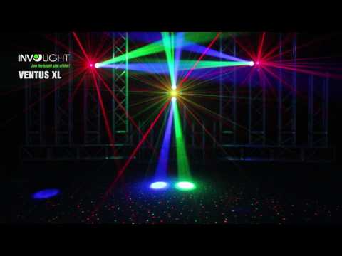 INVOLIGHT VENTUS XL – динамичный многолучевой светодиодный прибор 3 в 1 клубной серии, создающий динамичные световые эффекты красного, зеленого, синего, пурпурного и белого цветов плюс строб-эффект плюс лазерный эффект красного и зеленого цветов. В качестве источников света используются 25 (RGBWA) светодиодов по 1 Вт, двенадцать белых светодиодов по 1 Вт на фронтальной поверхности и два лазерных излучателя красного (100 мВт) и зеленого (50 мВт) цветов. При подключении DMX-контроллера можно управлять направлением, скоростью вращения и цветом лучей, усиливать визуальные эффекты стробом с переменной частотой вспышек, а также выбирать программы лазера.