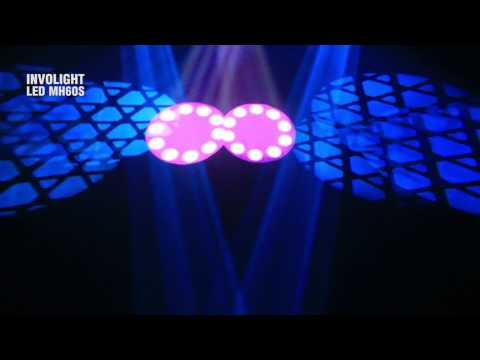INVOLIGHT LED MH 60S – вращающаяся голова с мощным белым светодиодом 50 Вт в качестве источника света. Оптические эффекты создаются при использовании семи металлических пластин гобо и восьми светофильтров разного цвета. Угол раскрытия луча 14 - 17° (ручной зум), электропривод для его фокусировки. Режим звуковой активации, возможность управления по 8/14 каналам DMX. Визуальные эффекты усиливаются стробом и изменением яркости свечения.