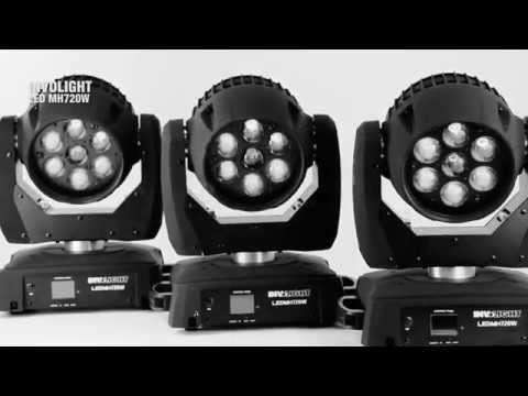 INVOLIGHT LED MH 720W – мощная светодиодная вращающаяся голова заливного света. 7 четырехцветных (RGBW) светодиодов мощностью по 20 Вт. Угол раскрытия луча 11 – 58° (моторизованный зум). Управление: DMX-512, звуковая активация, мастер/ведомый, автоматический режим.