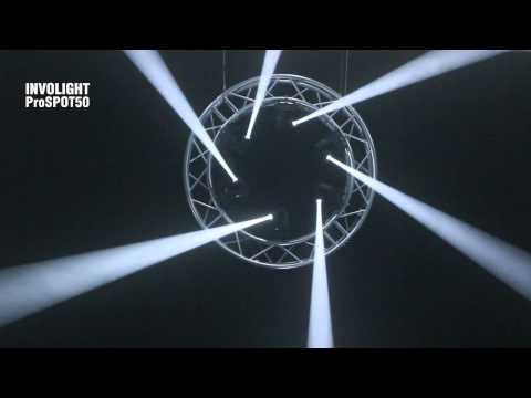 INVOLIGHT PROSPOT 50 – вращающаяся голова с мощным (50 Вт) и ярким белым светодиодом нового поколения. Оптические эффекты создаются при использовании семи металлических пластин гобо и шести светофильтров разного цвета. Угол раскрытия луча 11,9°, электропривод для его фокусировки. Управление: DMX-512, звуковая активация, мастер/ведомый, автоматический режим. Визуальные эффекты усиливаются стробом и изменением яркости свечения.